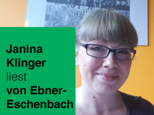 Sie liest die Erzählung Die Sünderin aus dem Erzählband „Stille Welt“ (1915) von Marie von Ebner-Eschenbach.