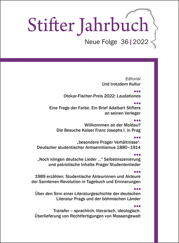 Im Juli 2022 veranstaltete der Adalbert Stifter Verein ein Kolloquium zu Konzepten der Literaturgeschichtsschreibung über die böhmischen Länder: Mirek Němec sprach über den Sinn von Literaturgeschichte dieses spezifischen Raums, und Juliane Prade-Weiss untersuchte, wie Rechtfertigungen von Massengewalt zwischen Kulturräumen wandern. Beide Vorträge sind hier abgedruckt, ebenso wie weitere Beiträge der Tagung von 2021 über Prager Studentenbewegungen: Harald Lönnecker, der leider im Sommer verstorbene langjährige Leiter des Burschenschaftsarchivs im Bundesarchiv in Koblenz, widmete sich dem Antisemitismus in den Prager Burschenschaften um 1900; Peter Becher untersuchte die nationale Semantik von Studentenliedern im 19. und frühen 20. Jahrhundert, und Zuzana Jürgens arbeitete Selbststilisierungstrategien in Erinnerungstexten von studentischen Zeugen der Samtenen Revolution heraus. Außerdem dokumentiert Jozo Džambo ausführlich die Besuche Kaiser Franz Josephs in Prag, und wir lassen Sie teilhaben an einer bemerkenswerten Erwerbung des Adalbert Stifter Vereins: Einen originalen Brief unseres Namensgebers an seinen Verleger Gustav Heckenast finden Sie als Reproduktion und Transkription im Jahrbuch. Die Laudationes zum Otokar-Fischer-Preis, der Jahresbericht 2022, Rezensionen und eine Zeitschriftenschau ergänzen wie immer die wissenschaftlichen Beiträge.