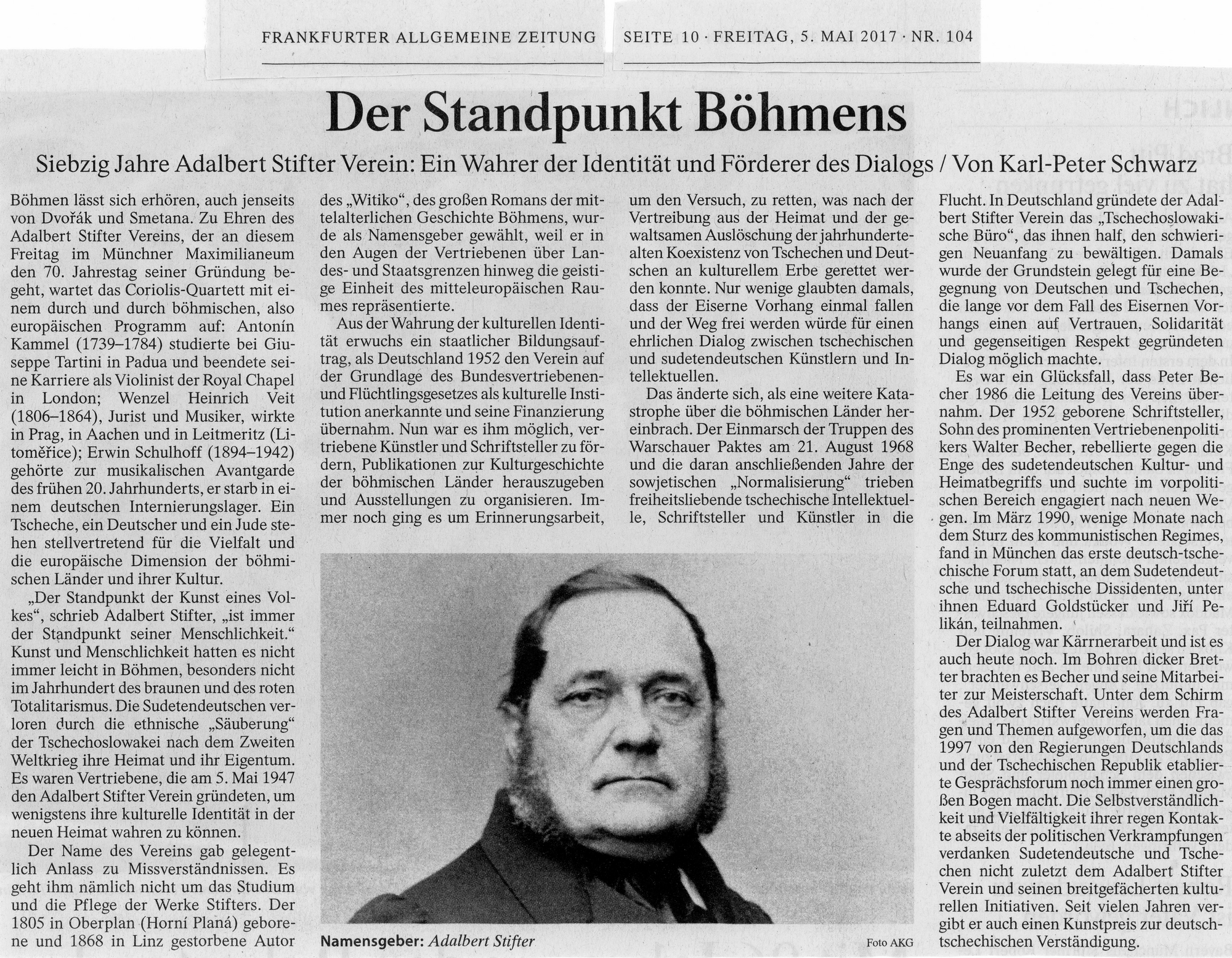 Karl-Peter Schwarz: Der Standpunkt Böhmens. Siebzig Jahre Adalbert Stifter Verein: Ein Wahrer der Identität und Förderer des Dialogs