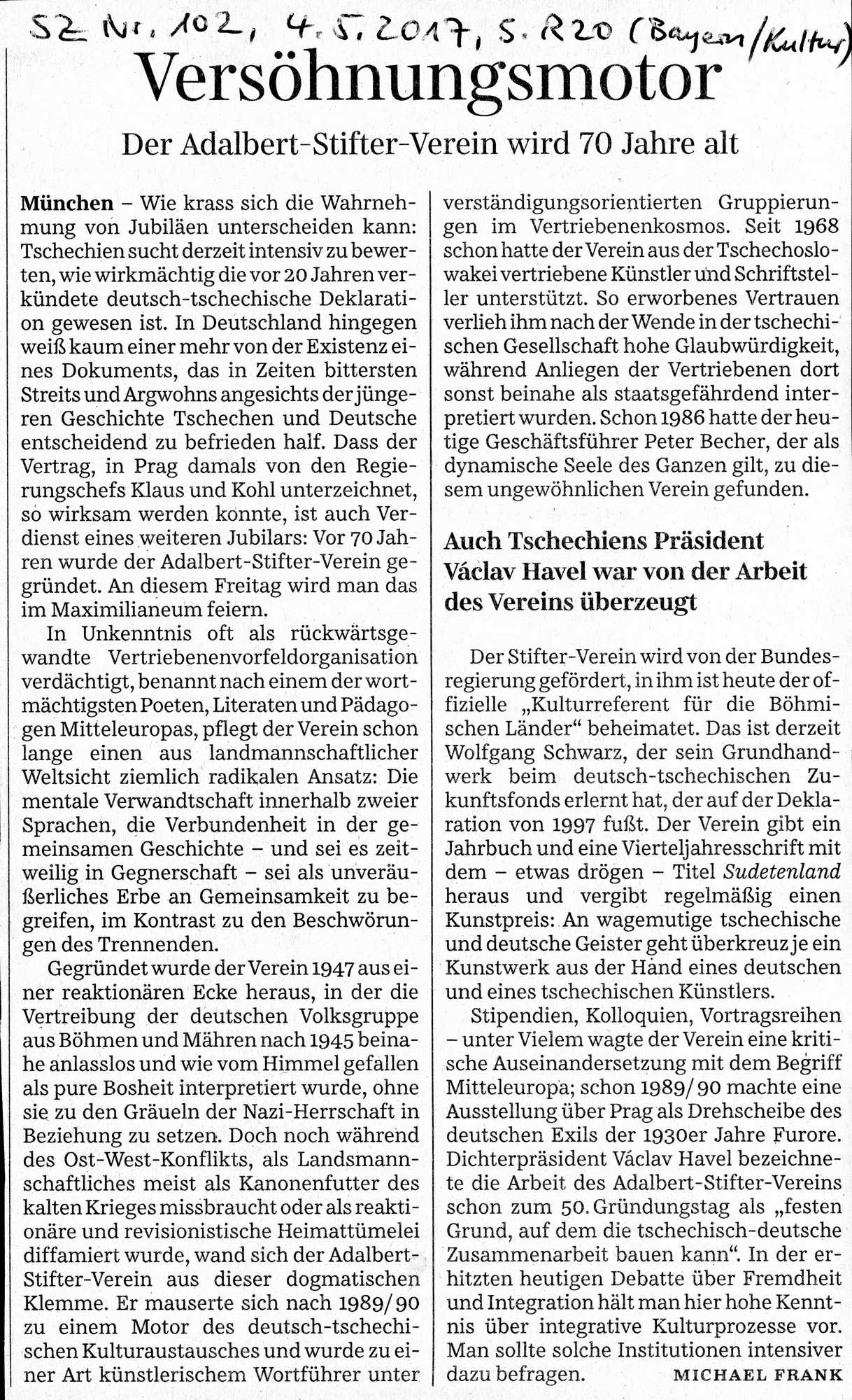 Michael Frank: Versöhnungsmotor. Der Adalbert-Stifter-Verein wird 70 Jahre alt